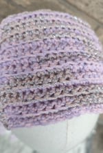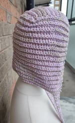 This hand crocheted ribbed bonnet features long narrow ribbed ties. They can be tied under the chin in a bow with long tails.