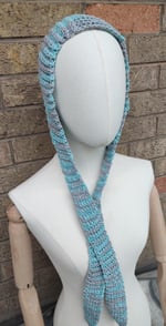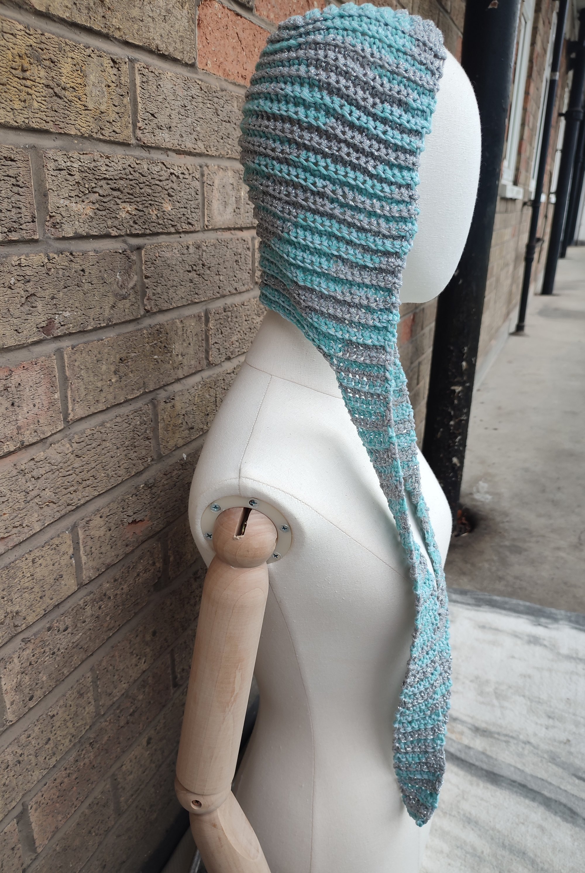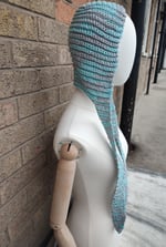 Icy winter blue skies,grey clouds illuminated with light giving a silver halo. The inspiration behind this cotton, polyamide and metallic fibers hand crocheted ribbed bonnet.