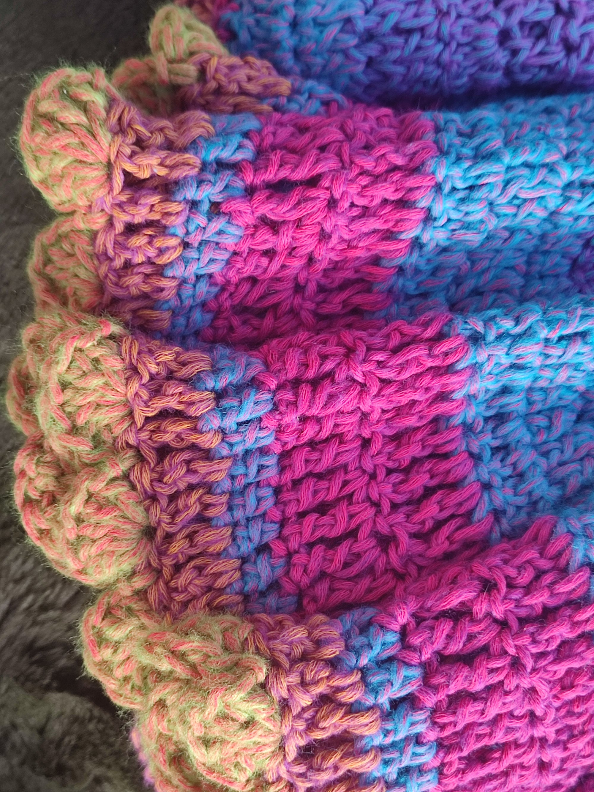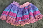 Soft shells of mustard yellow wrapped in faded dusky pink, alongside seaweed covered like shells of rust and mossy green. Above them stripes of other two toned colours. Royal blue wrapped in purple, purple wrapped in royal blue. The waistband split between purples and peach like a purple shell revealing it's flesh.